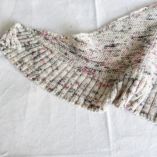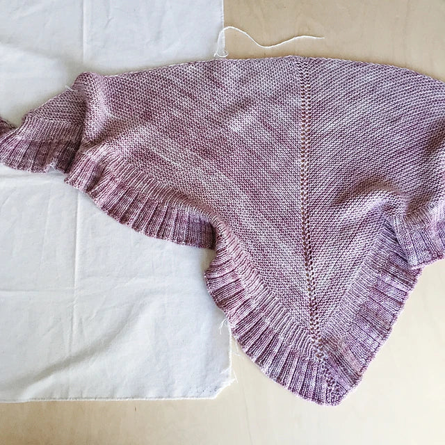 A simple garter-stitch triangle shawl, worked from the top down and trimmed with a pleated border. This flexible pattern can be worked larger for a full-sized shawl or smaller for a petite shawlette.