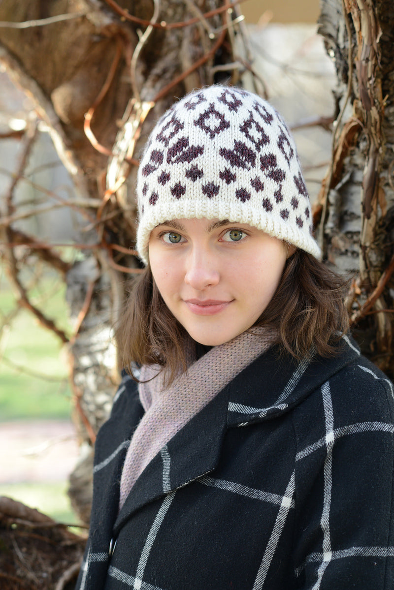 Hat is worked from the bottom up. Crown decreases are incorporated into the colorwork chart. To adapt the height of hat, work more or less ribbing and/or omit the first 4 rnds of the colorwork chart. The bottom rib is folded up to inside and whip stitched in place.
