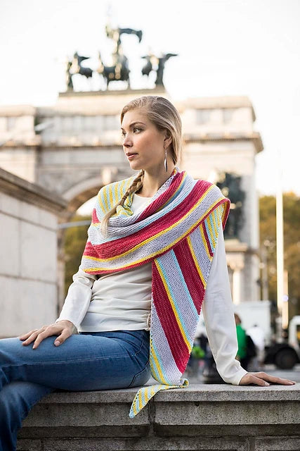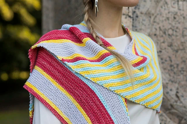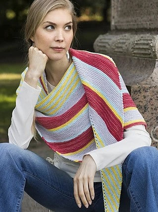 This fun striped shawl is knit on the diagonal in garter stitch. Pick out your favorite 4 colors of our beautiful new cotton yarn and have fun with this easy knitting experience.