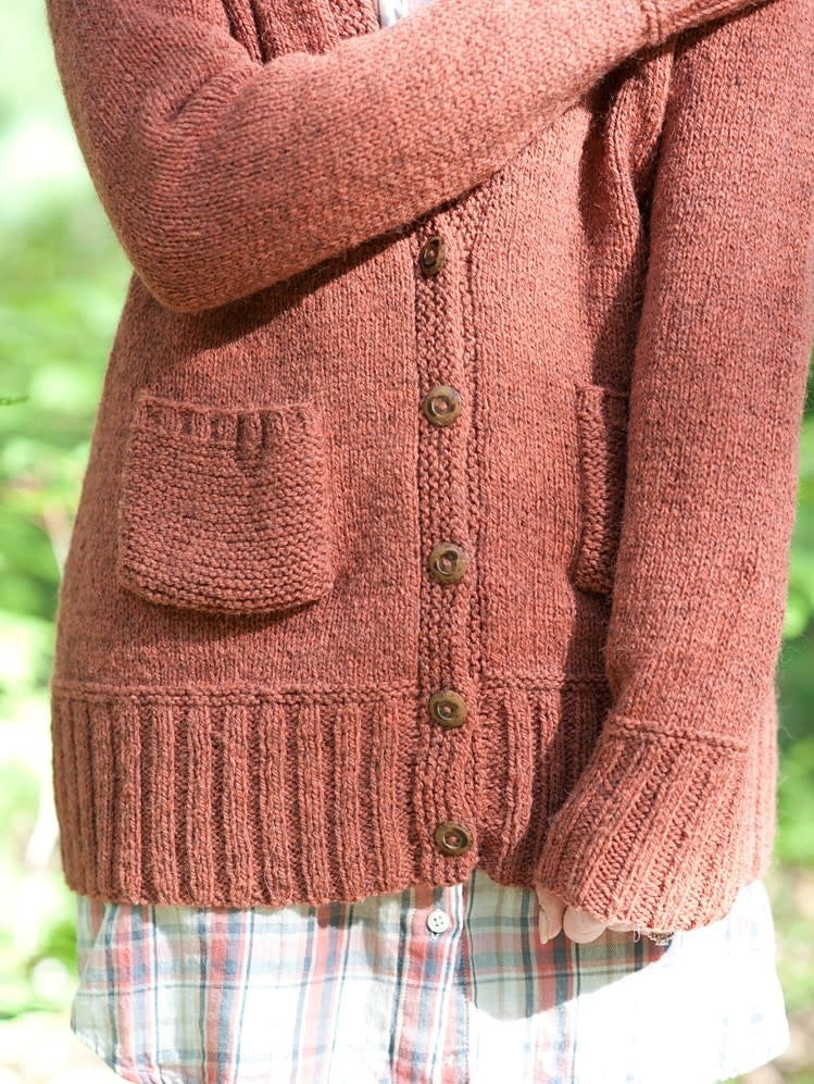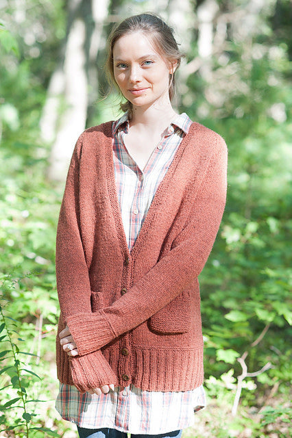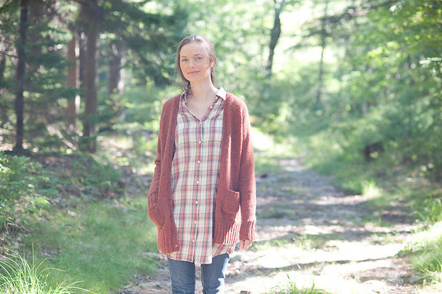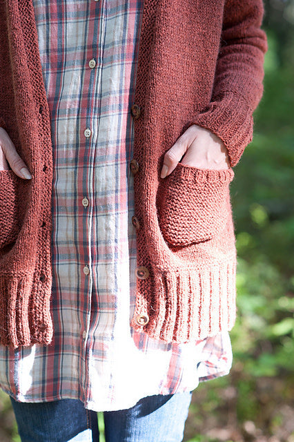 Maude is a comfy, cozy, grampa-style cardigan. Maude hits a little bit longer in the body and has snuggly long sleeves and big garter stitch pockets. Oh, yes.