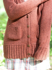 Cardigan is worked in one piece from bottom border to the armhole. Sleeves are knitted flat and joined to the body at the underarm. Then the yoke is worked in one piece with raglan shaping. Patch pockets are