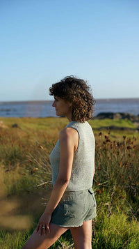 May Top is a light summer version of our popular Timbo Vest pattern. In this new design we wanted to maintain the original constructive and formal characteristics: it is knitted from top down in a simple and interesting broken rib stitch with a detail on the shoulder in stockinette stitch. The ideal project if you want to knit a nice top to wear every day on summer days.