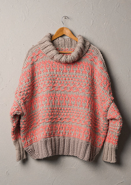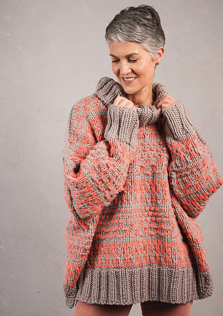10 sts to 10 cm and 34 rows (one full pattern repeat) to 7.75”(20 cm) measured over a combination of both US 13&15 (9mm & 10 mm) needles.