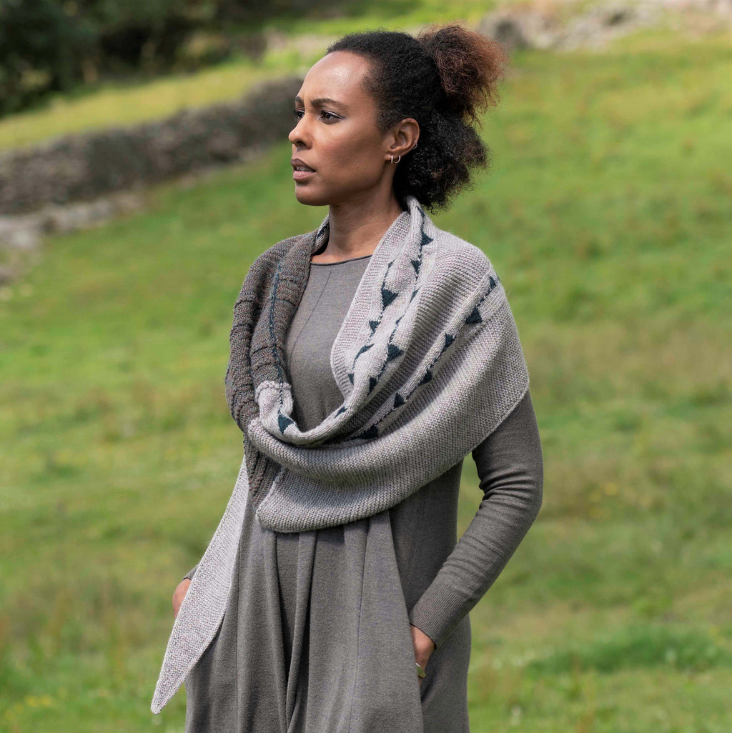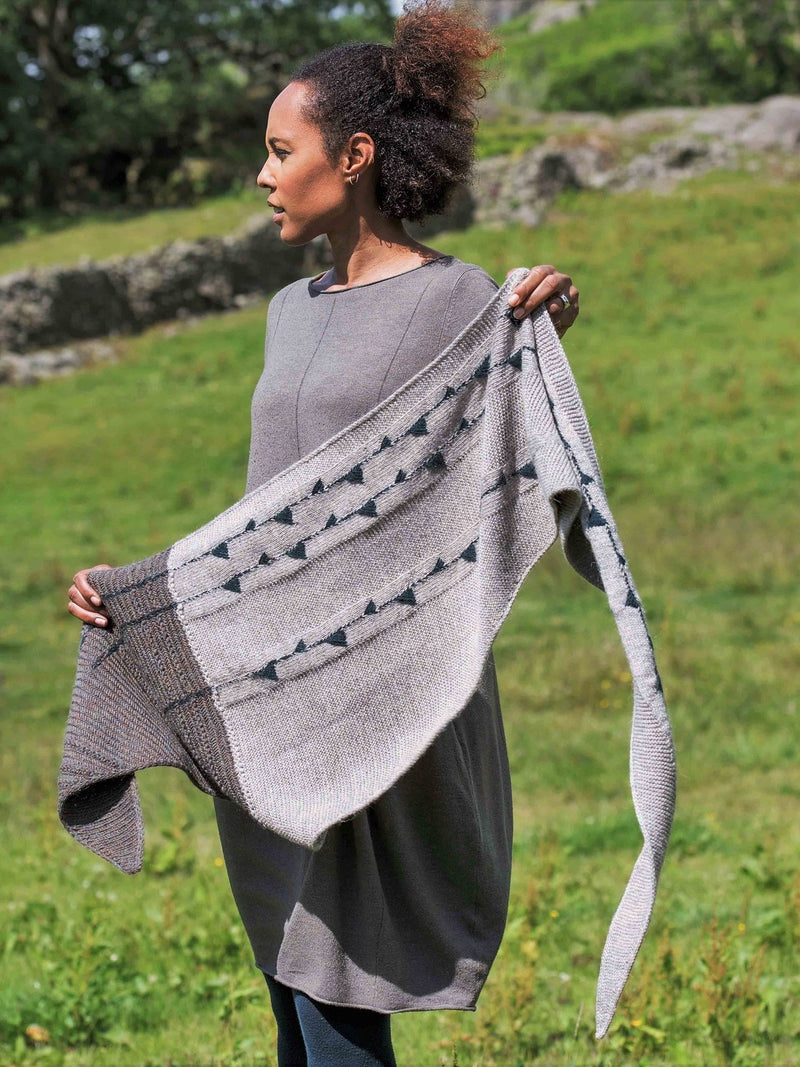 The shawl has been designed so that each shade of Cumbria Fingering has a different stitch pattern; garter and stockinette stitch in Scafell Pike, herringbone stitch in Fair Hill and a stunning flower stitch in Blackbeck.