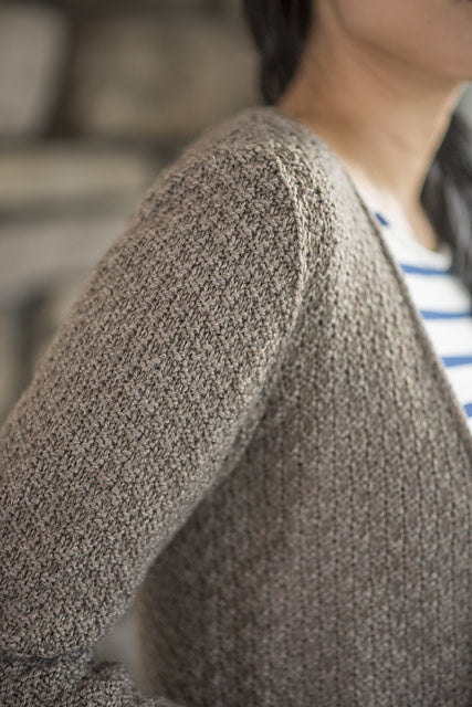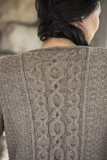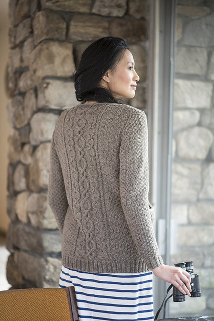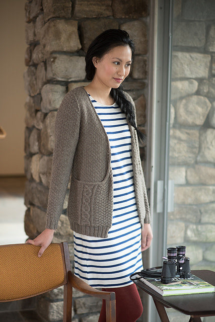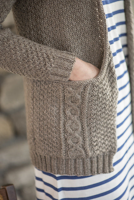 The generous pockets of this cardigan are knit as you go, making for a unique knitting experience. Designed by Emily Ringelman, this open-front cardigan is knit from the bottom up and features a simple cable panel along with an all over textured stitch pattern.