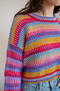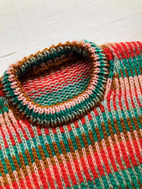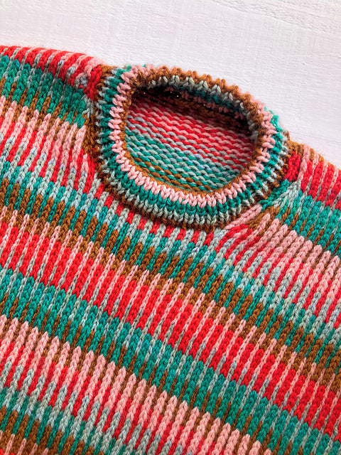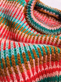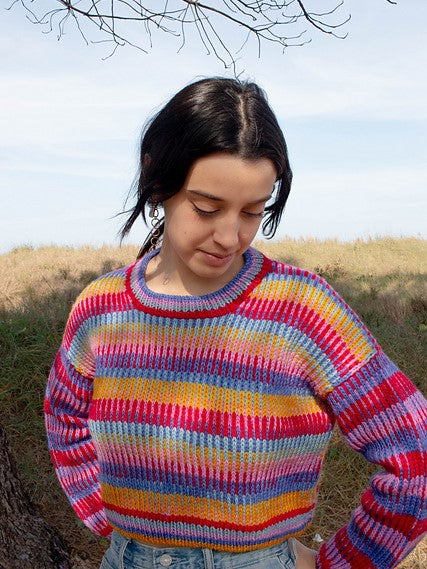 The Minas Sweater is a playful celebration of color, featuring an engaging 1x1 stranded colorwork design that captivates us with its rhythmic patterns and constant shifts.