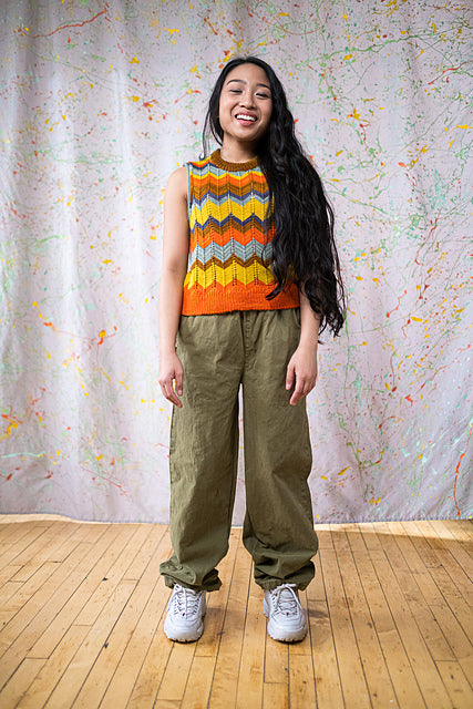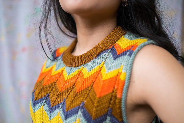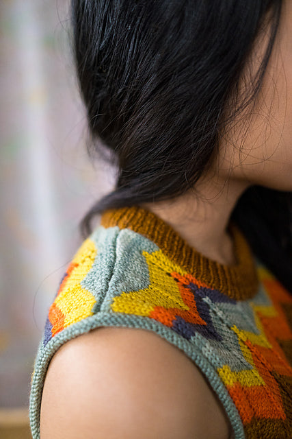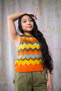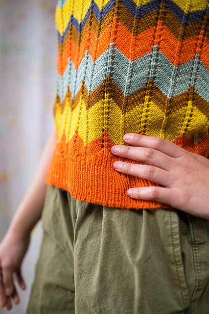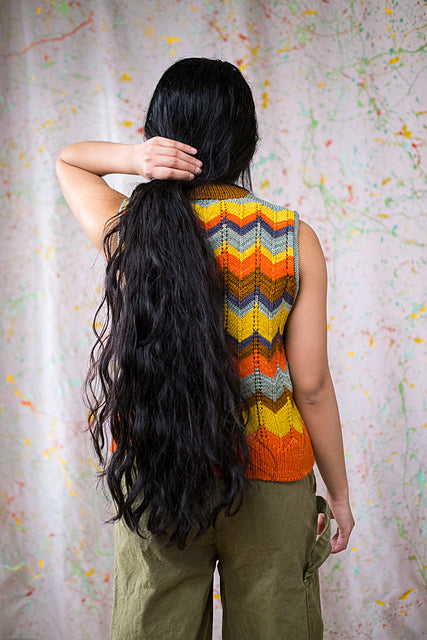 As shown, MiZZoni is a fun and funky tank -- but change the colors and choose a size with positive ease and you’ll get a dapper vest. Subtle details add up to a refined look: tubular cast-on, short-rows at the transition from ribbing to chevron stitch (and again at the shoulder shaping), foldover neck ribbing. The pattern includes a blank stripe template for you to color in to try out your own ideas!