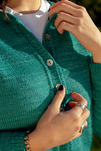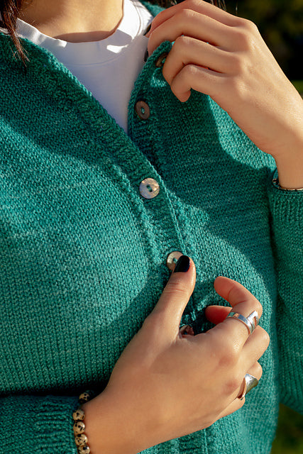 It has a beautiful herringbone detail running at the raglan and placket seam. Montevideo can be knitted in either Sami (as the sample) or Marla yarns, depending if you are looking for a solid or colorful style.