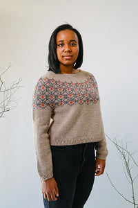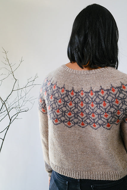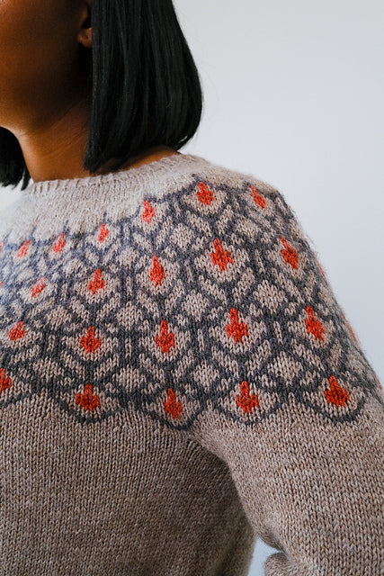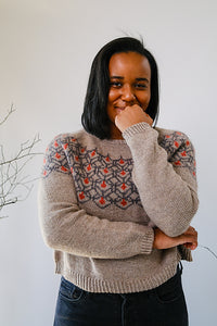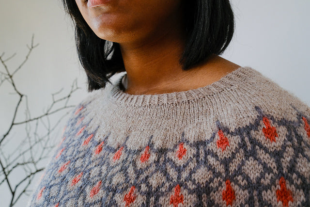 The Moonflower Sweater, knit in 3 colors of delightfully cozy Alpaca Heather, features a repetitive and relaxing colorwork pattern at the yoke. Its design is reminiscent of the last of the fall blooms and evokes memories of apple picking and enjoying a warm cider donut after.