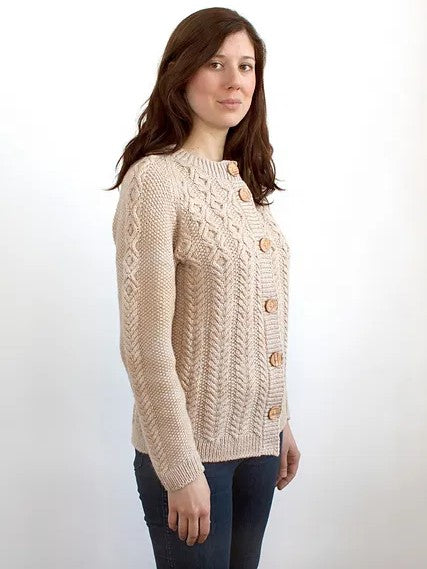 The lower body is worked in one piece, back and forth in rows, to the underarms. The sleeves are worked in the round to the underarms, then the body and sleeves are joined for working the yoke in rows to the neck edge.