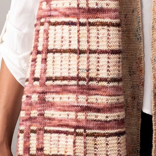 Knit in Hedgehog Fibres Sporty Singles, the wrap has both softness & the perfect amount of drape. The hand-dyed colorways of Hedgehog Fibres give the plaid a very modern feel with subtle speckles & tonality.