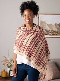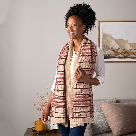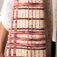 The wrap is a stunning work of design that may be worn all year long. Wear as a wrap for more warmth or drape over shoulders as a generous scarf. The plaid effect is cleverly achieved through slipped stitches & working just one color per row! Once knitting, the piece becomes quite rhythmic.