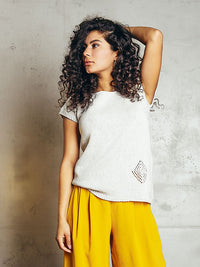 The Munja shirt has short Raglan sleeves and is worked top down in rounds. You start knitting at the neckline that is shaped with help of short rows. At the same time, you work raglan increases for body and sleeves. The back part of the body is fully worked in a lace pattern. Front and sleeves are knitted in stockinette stitch, with a detail of the lace pattern accentuating the front part.
