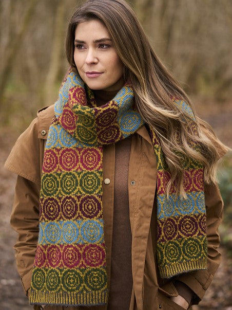 Scarf is knit in the round and folded to be double thickness when finished.