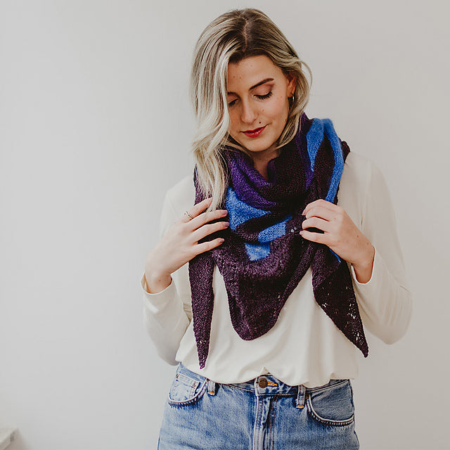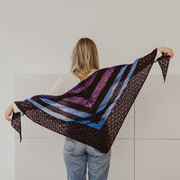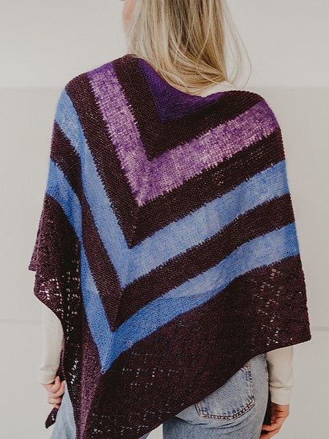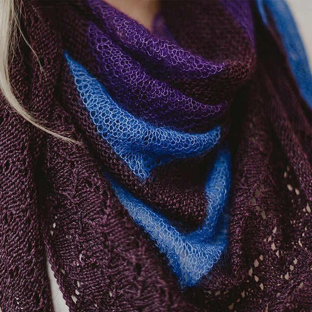 NALEDI is a symmetrical triangular shawl. The use of two quite different yarns – the smooth and slightly shiny Pinta alternating with the light and fluffy Mohair Bliss – gives it a very special touch. The body is worked in colour blocks in garter stitch, the broad edge is worked with a geometrical lace pattern.