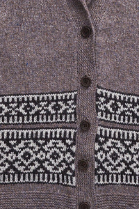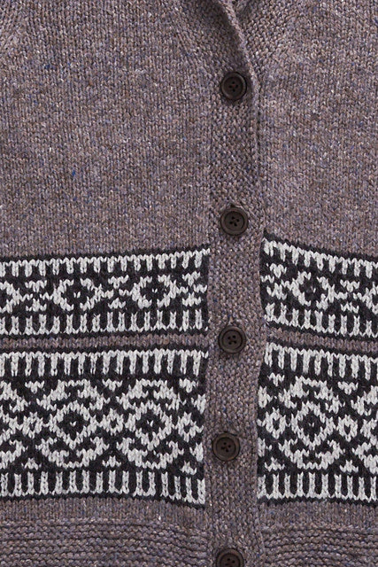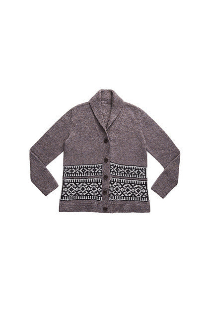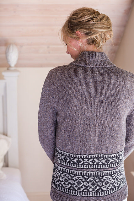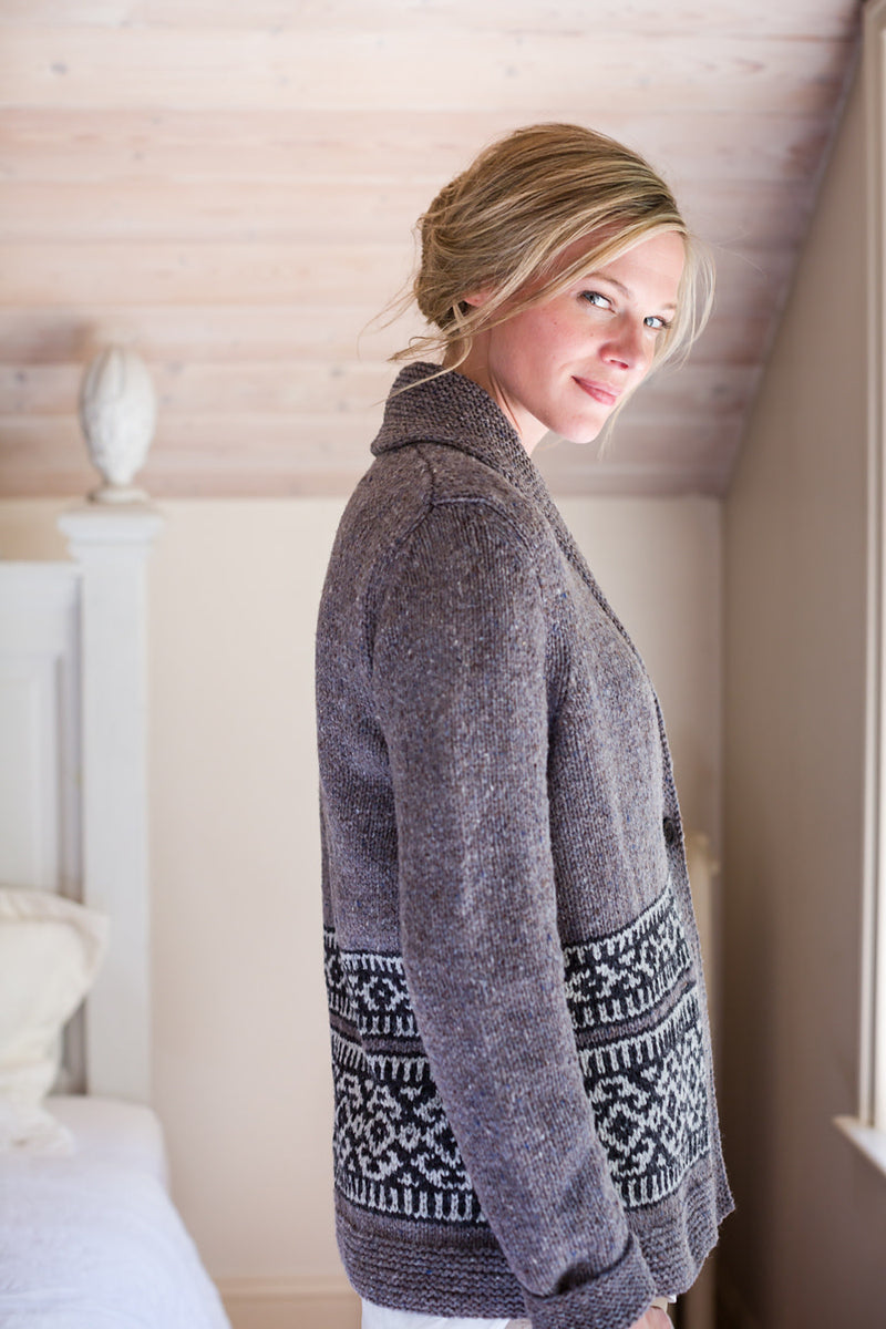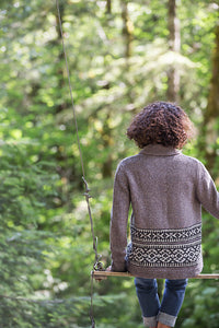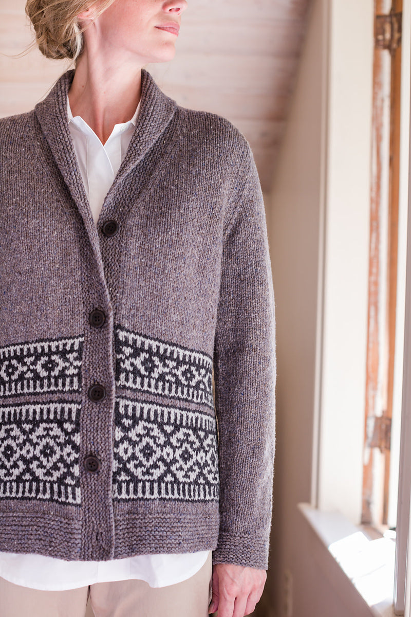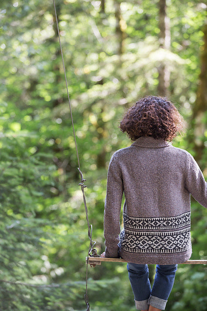 Inspired by the beautiful sweaters designed by the Cowichan knitters of Vancouver Island, Nehalem is a shawl-collared Shelter cardigan with bands of geometric colorwork adorning the lower torso. Gentle A-line shaping allows for comfortable layering over fall outfits and the garter-stitch shawl collar, shaped with short rows, folds snugly about the neck. Nehalem is worked with a steek at the center front so you can knit the colorwork in the round. Sleeves are also worked in the round to the underarm; the caps are knit flat and set in. The quiet, monochrome palette we chose nods to the natural sheep shades that characterize Cowichan colorwork, but feel free to knit up a blaze of autumn glory with our red and orange hues.
