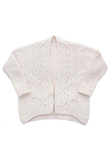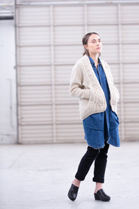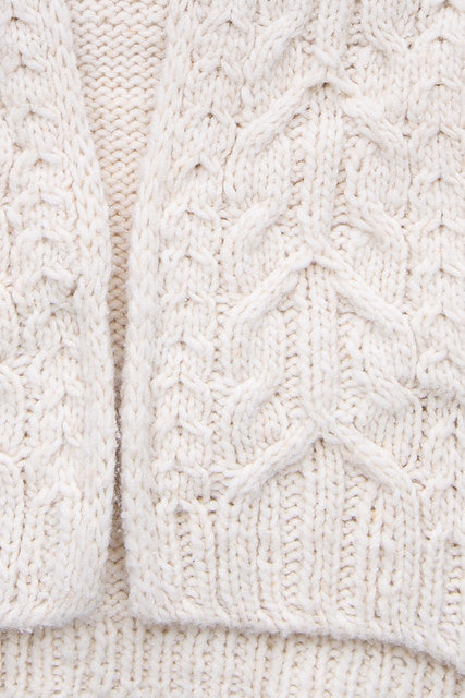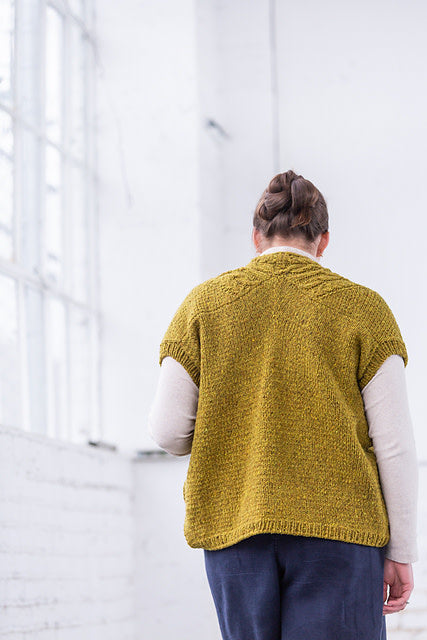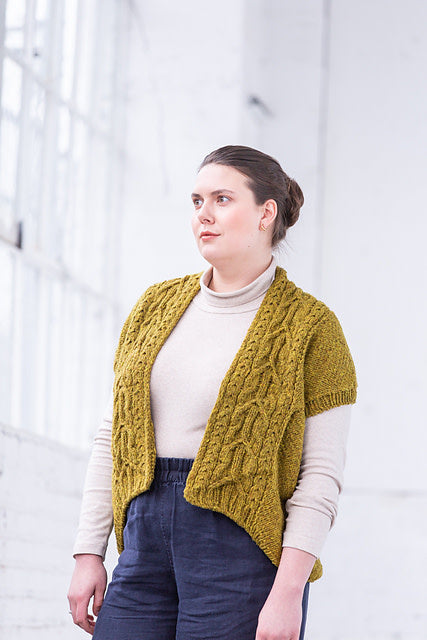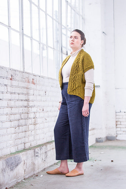 With the option to knit as a sleeveless vest or a long-sleeved cardigan, Newel is a thick cabled garment with plenty of modern appeal. With bias stockinette stitch front panels and knit in Quarry yarn, Newel strikes a balance of rusticity and elegance. Wide cables adorn the collar and front bands, integrating cleverly with pockets that complement the overall wearability of Newel.