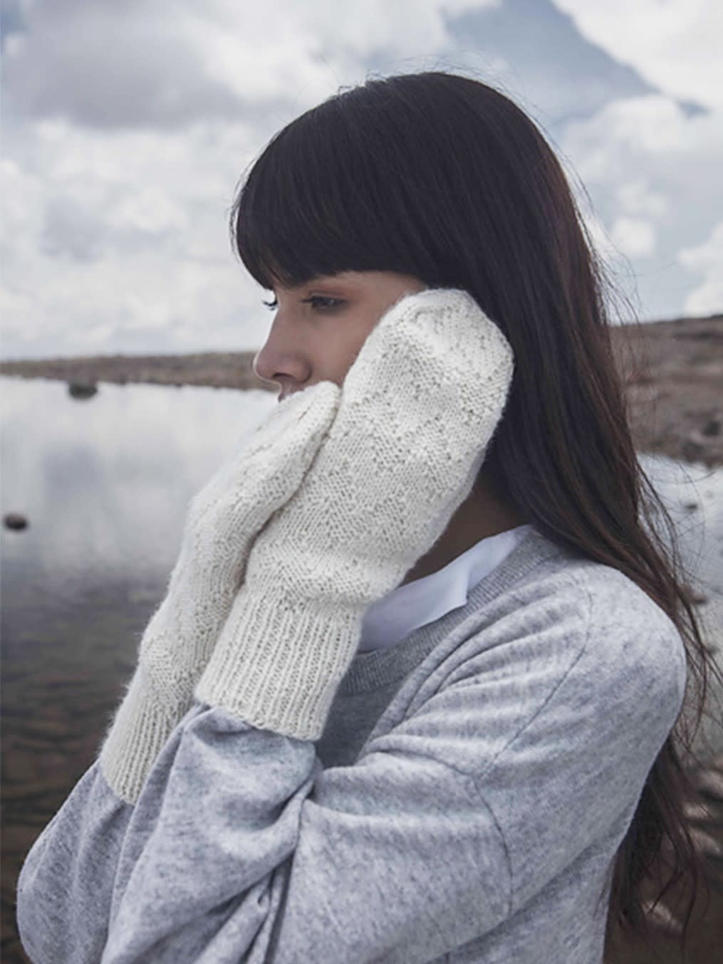 Mittens are worked with a double strand of Apu and are worked in the round from the bottom up. The pattern stitch instructions are both written and charted.