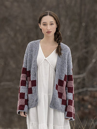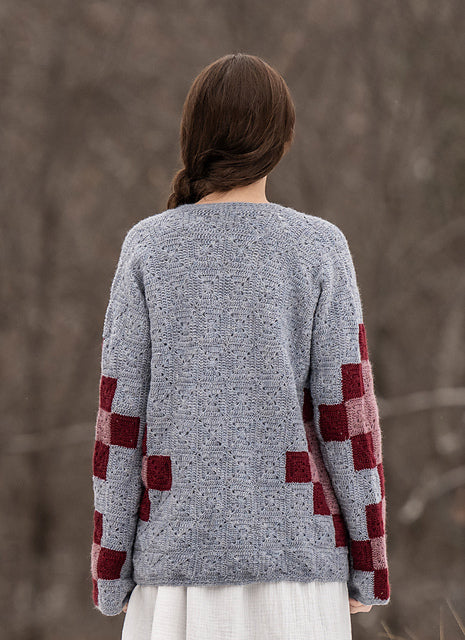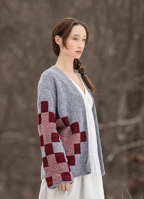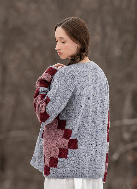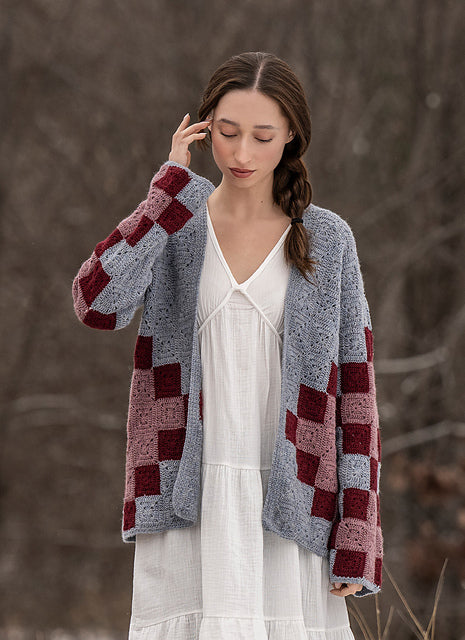 This unique cardigan uses simple, solid granny squares to mimic the blocks of an heirloom quilt. Crocheted in Woolstok Light this cardigan is lovely and provides extra warmth.