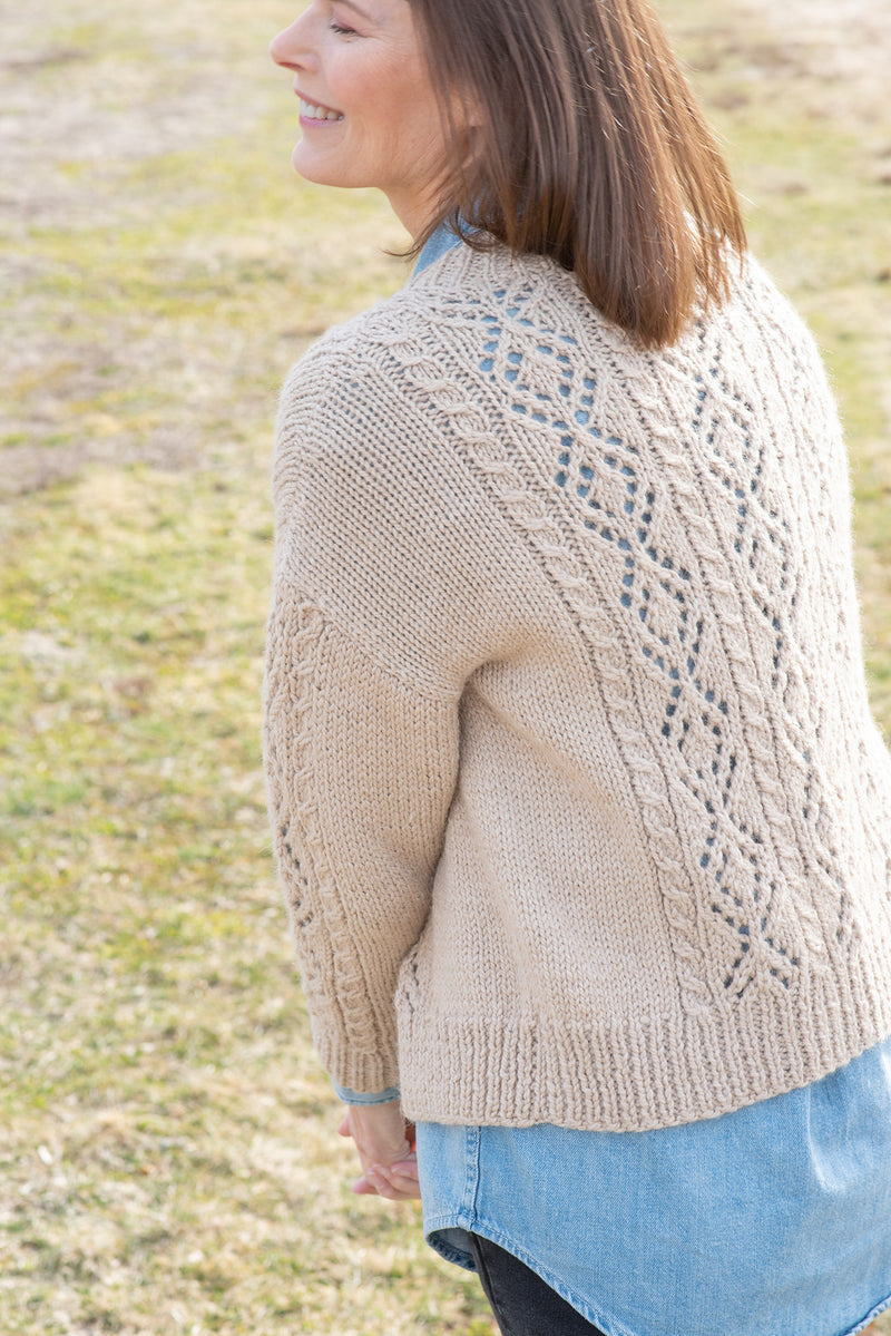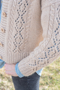Perahta is a classic cardigan worked with panels of cable and lace motifs on the body and sleeves. Worked from the bottom up in pieces and seamed.