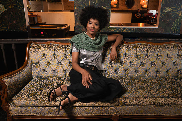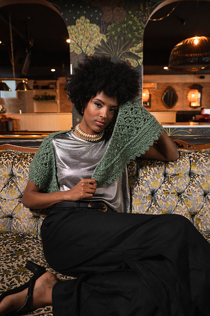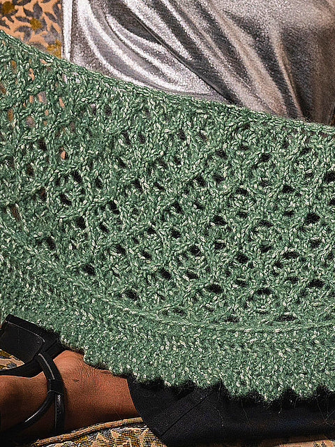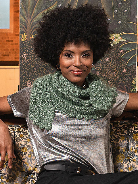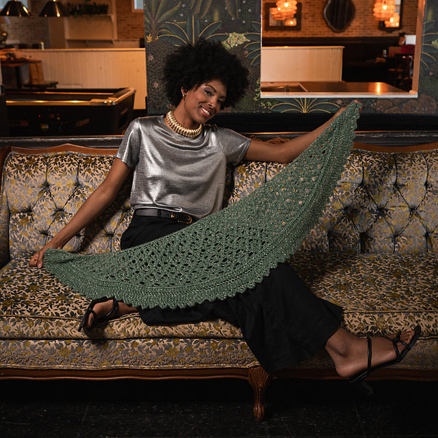 Subtle shimmer and sophisticated lace elevate this top-down crescent shawl into a special occasion-worthy project. Soft and warm, Peridot has a knitted-on border to finish with a flourish.