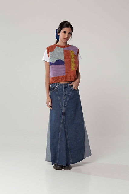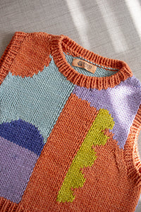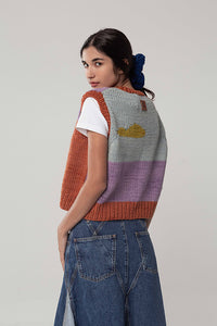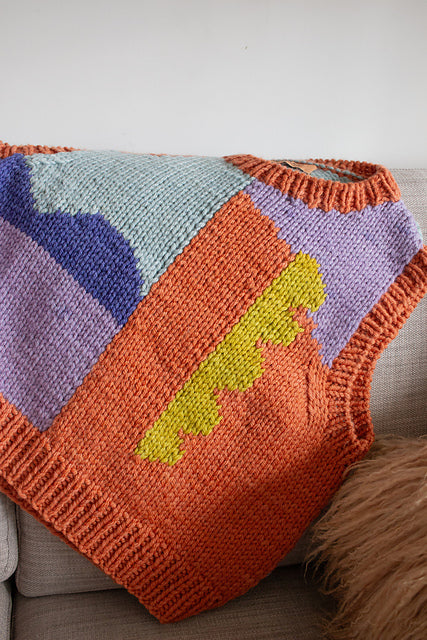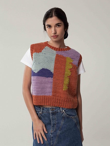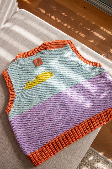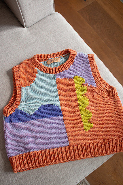 The Pierrot Vest has a simple boxy shape and a fun graphic motif. It is a great way to get you started in intarsia as it is a simple project that is fun and easy to knit!