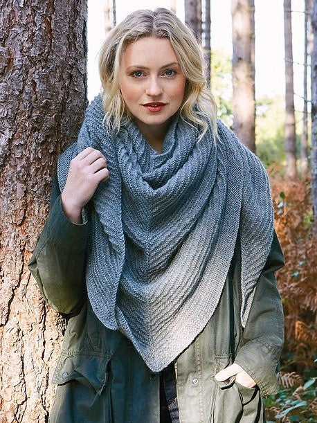 Knit this ladies accessory scarf from Moordale, a design by Martin Storey using Moordale, a premium blend of the finest British wool and alpaca (wool and alpaca.) This triangular scarf is knitted in a textured garter stitch and is the perfect trans-seasonal piece.