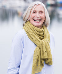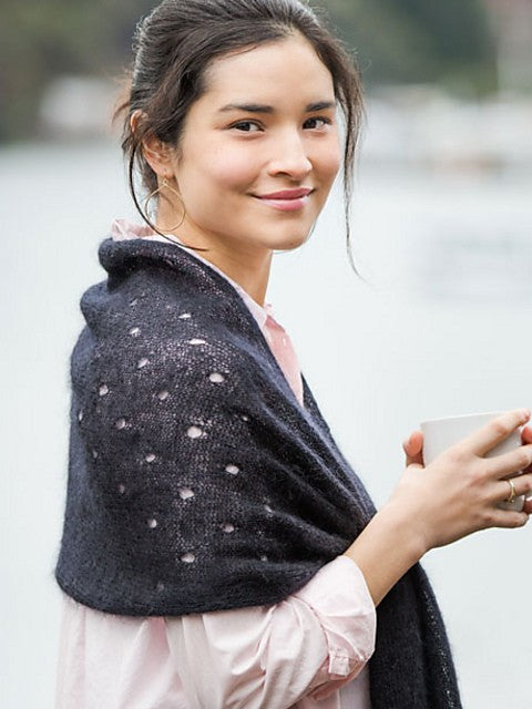 There’s something so cheerful about polka dots! They add a little fun to anything you wear. Here we’ve created ‘dots’ with a widely spaced eyelet stitch pattern that’s easy to knit and easy to remember. A slip stitch edging gives a slightly firmer edge to your scarf—no curling! Because the fabric is so light and floaty, a lavish scale seems just right. It’s a lot of knitting but the rows fly happily by.