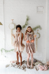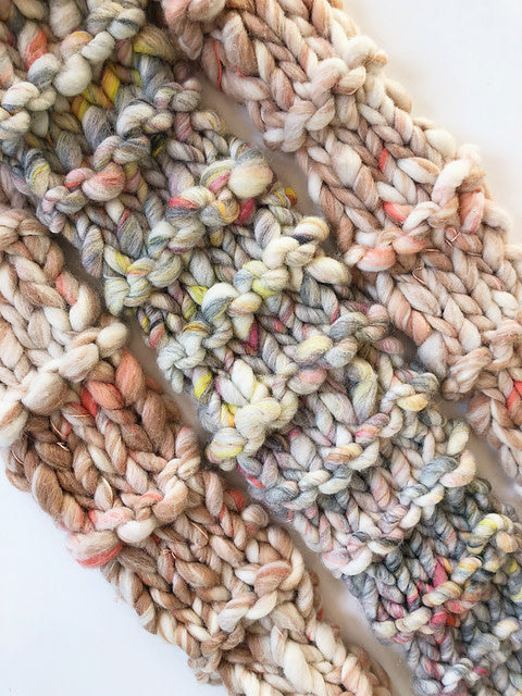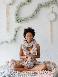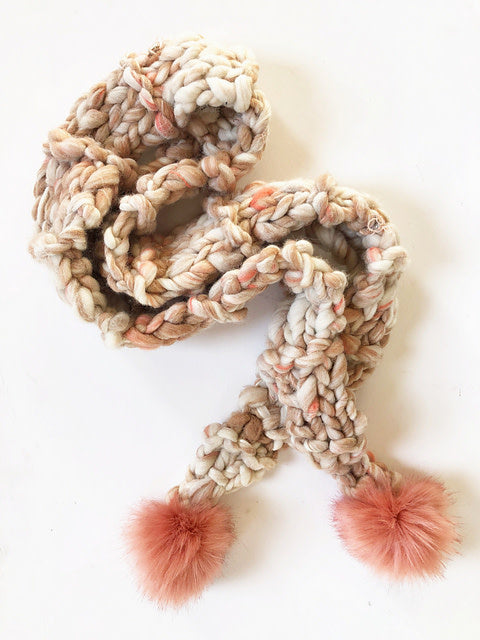 Finally our infamous Pom Bomb Hat has met it’s scarf husband! With 2 skeins of yarn, 2 faux fur pom poms and just a night of knitting, you’ll have yourself one serious statement scarf. I knit the scarves shown here in Wanderlust yarn colors Sand Dune and Free to Be. I used pom poms in color Fox Peach.