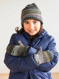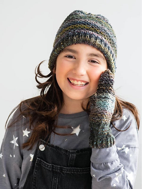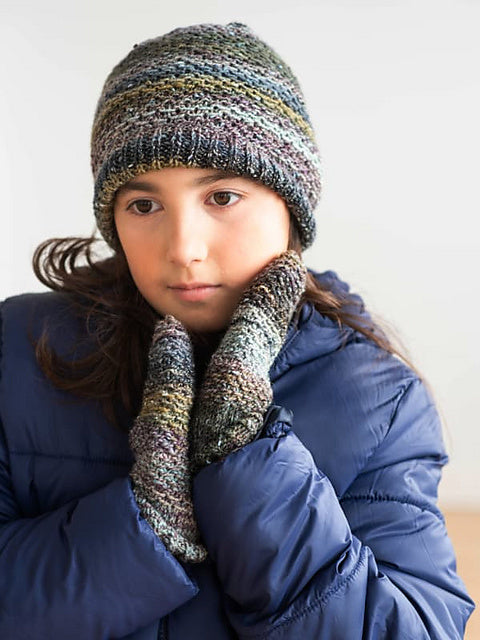 Beat the bus stop chill with our Poplar Hat and Mittens set! The simple textured stitch is a perfect backdrop to the color flow of our Sesame yarn.