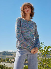 The sweater is knitted from the top down, with 3 strands of Tropical held together.