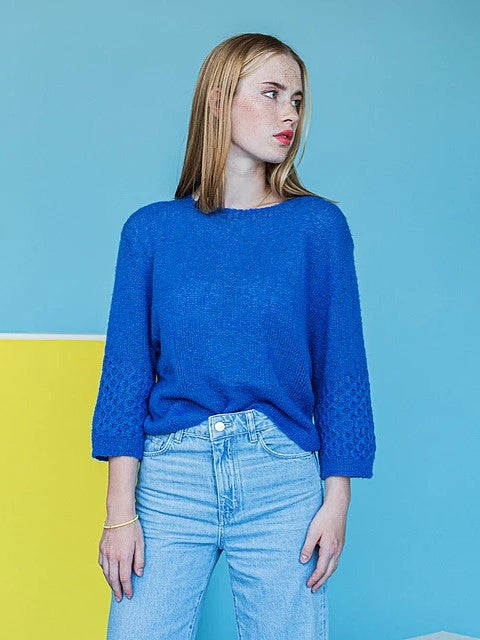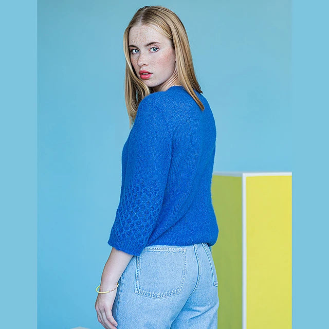 ANNYKA is a cropped pullover to be knitted with our mohair yarn, Manada. While the body is knitted in stockinette stitch, the sleeves have a bubbly pattern throughout. The body is knitted bottom up in rounds to the armholes before front and back are finished flat. Stitches for the three-quarter length sleeves are picked up at the edges of front and back and knitted top down in rounds with short rows.