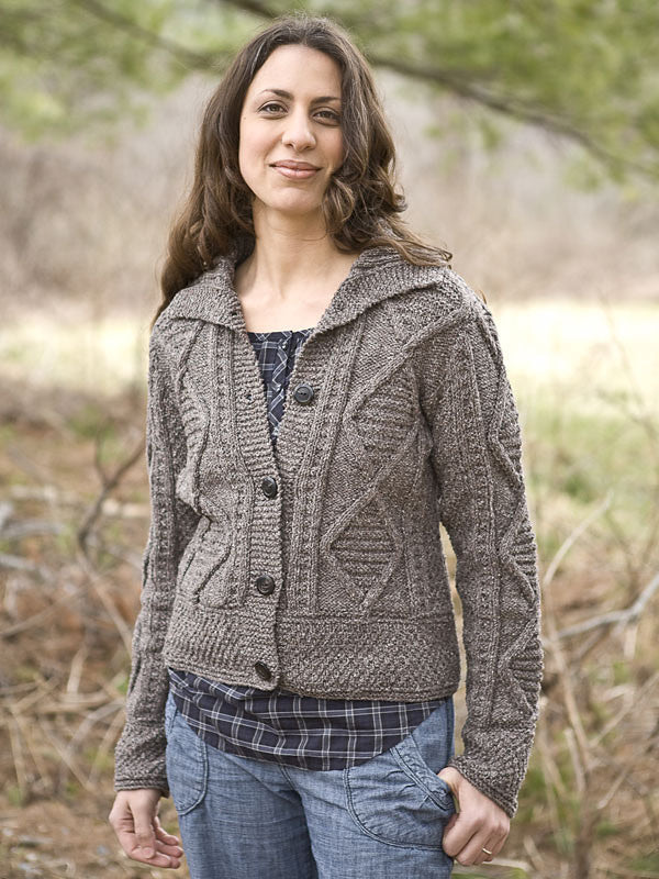 Rafik is a feast for the texture lover with a variety of stitch patterns and a knit-in garter stitch button band. This women's cardigan coordinates with Daron, the men's version.