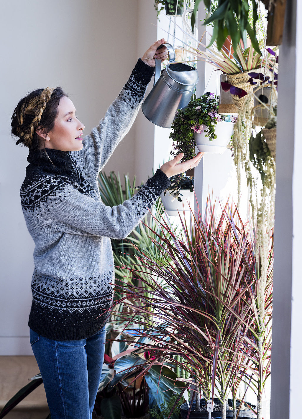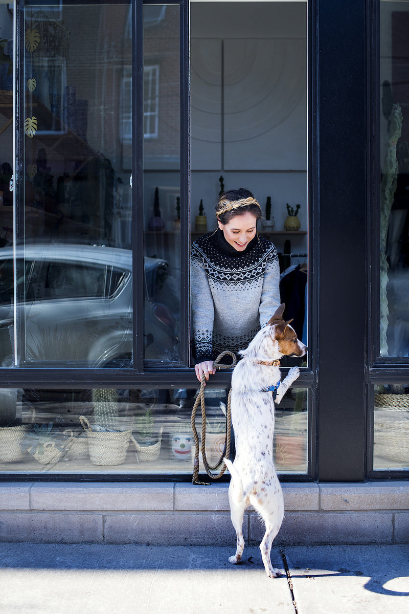 Rainier is worked in the round from the bottom up. The sleeves cuffs and hem begin with a long tail tubular cast on, and then a 1-by-1 ribbing is worked. Colorwork adorns the bottom of the sleeves and sweater body.