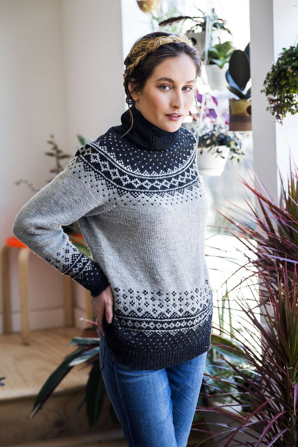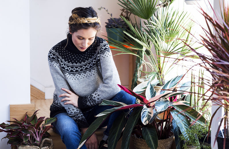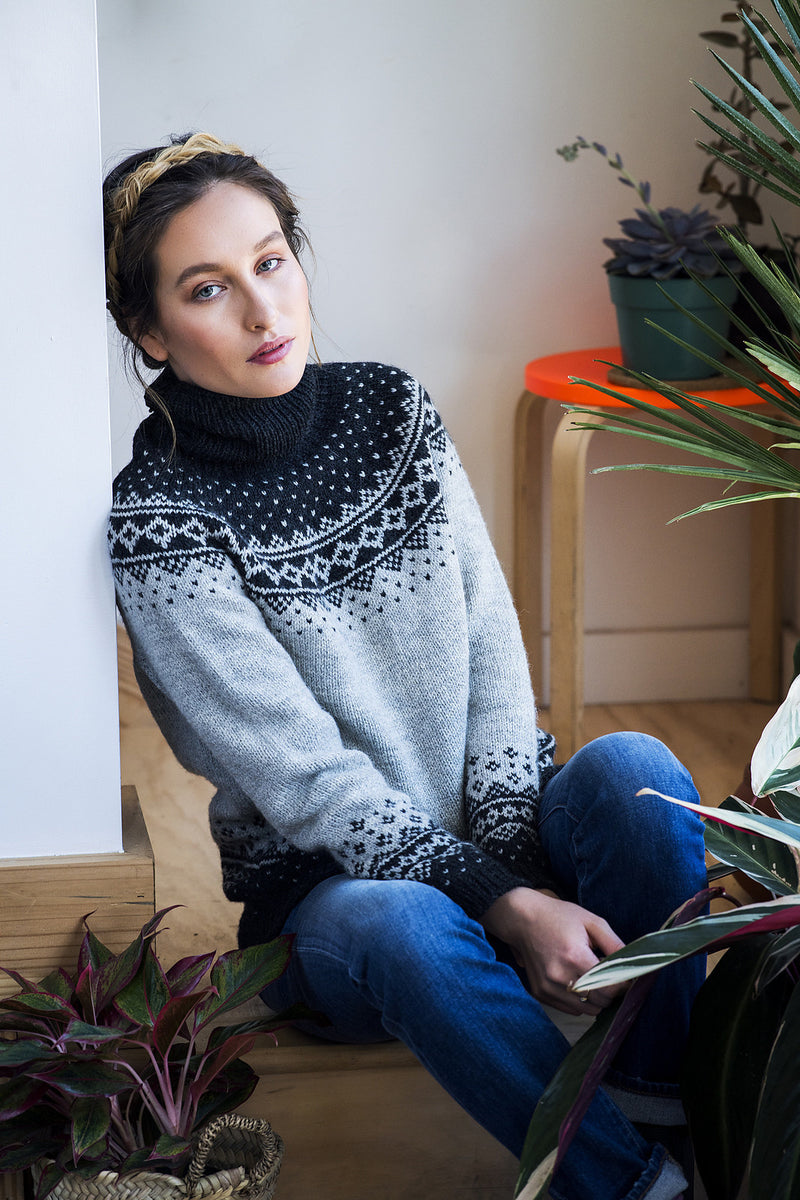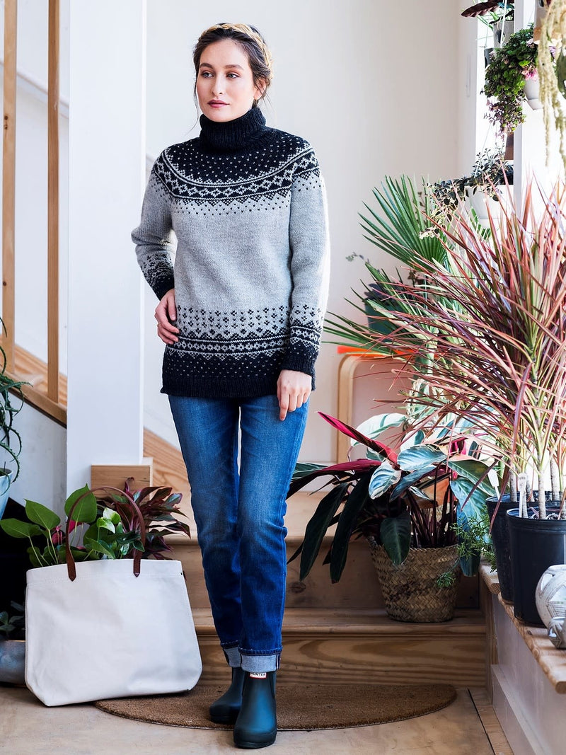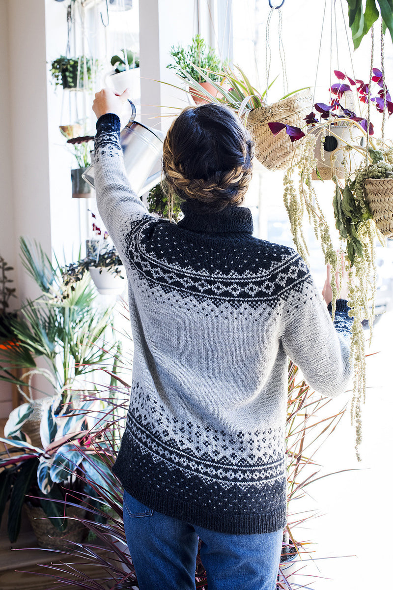 After the sleeves and body are complete, the pieces are joined to work the yoke. Raglan decreases shape the yoke, and then short rows are worked to raise the back neck. A colorwork pattern with integrated decreases is worked, and then a deep ribbed turtleneck finished with a tubular bind off completes the sweater. Pay careful attention to the size you are knitting when working the sleeve and yoke charts; different charts are given depending on the size to be worked.