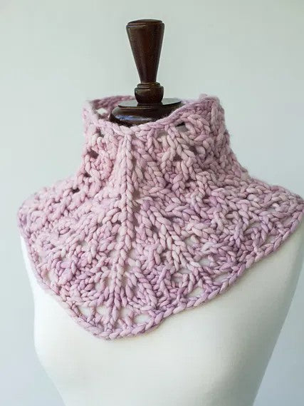 Bulky lace knits up quickly to make the most of one beautiful skein of the luscious Rasta. The construction allows it to stand up close to the neck providing warmth and the front increases create a flare to sit nicely across the chest and shoulders.