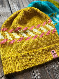 This hat is a wonderful way to play with colors. Pick ones that highly contrast with each other. The color work for CC1 and CC2 only uses 20 yards each. So a perfect way to use up extra bits of yarn.