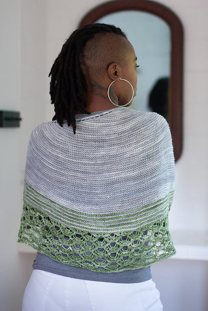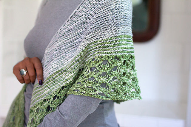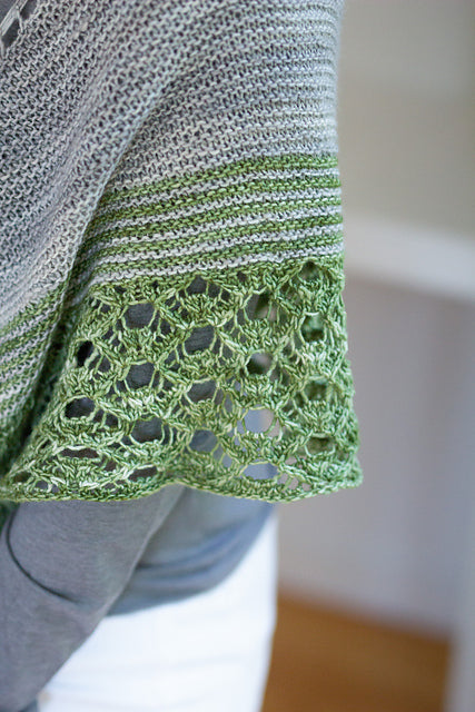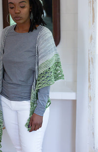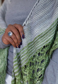 An unusual lace stitch used in a deep border and generous dimensions give this two-color crescent shawl sweep and flair.