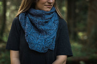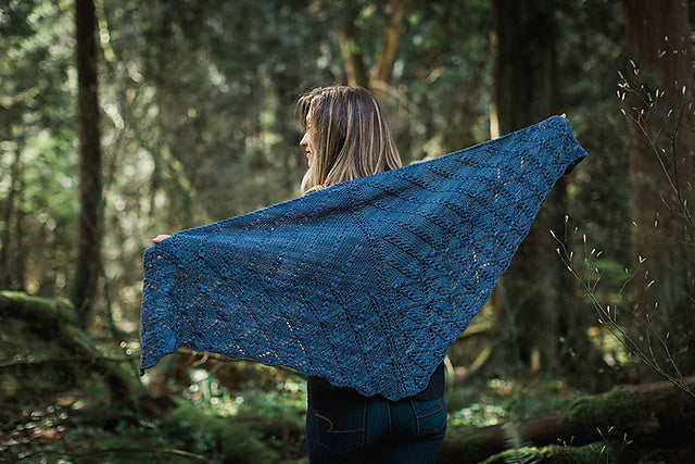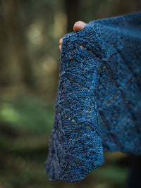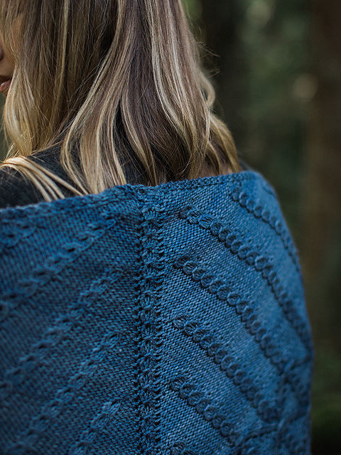 Rowenna is a triangular shawl, knitted from the top down, with increases on wrong side rows at the spine and each edge of the shawl. The top section of the shawl is worked in Mock Cable Pattern and has 4 stitch increases on every wrong side row. The lower section is worked in Trellis Pattern with 4 increases on every wrong side row and increases on some right-side rows. The shawl is edged with a narrow border of garter stitch. The lower edge of the shawl, once blocked, has a gentle scalloped shape.