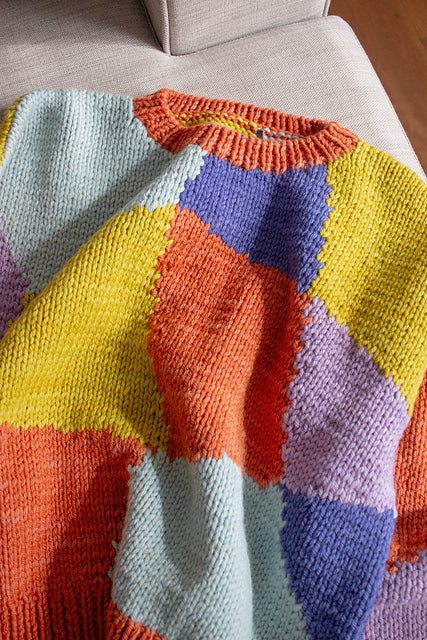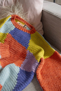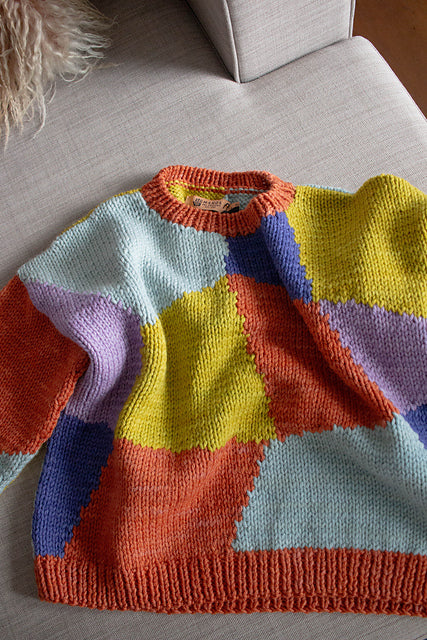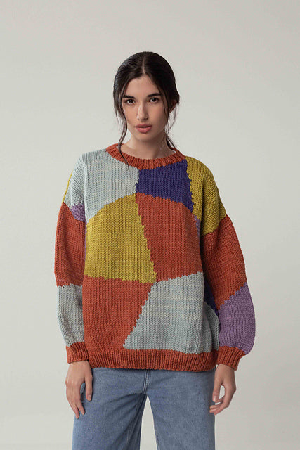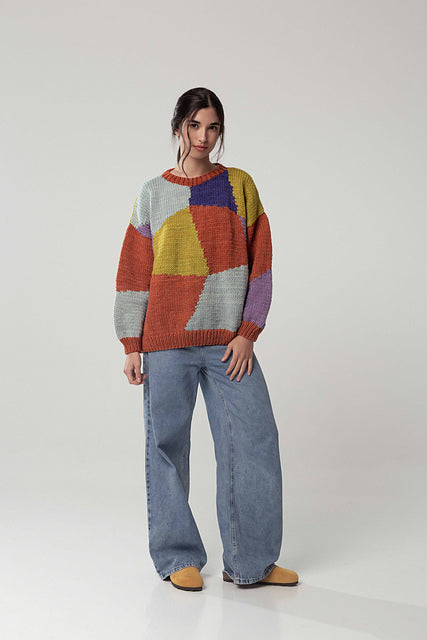 You will fall in love with the Salvador sweater for its playful geometric motif and its striking color combo. The fit is oversized and boxy, with a dropped sleeve.