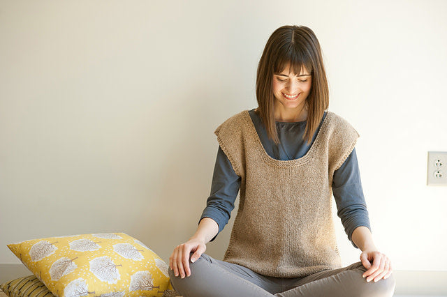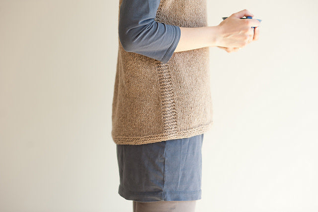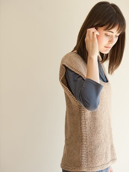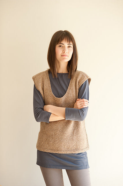 Sandy is a transitional piece created around Quince & Co.’s latest bird, Owl. A simple garter stitch detail runs up the sides and continues along the armhole edge. Simple to