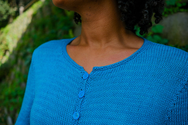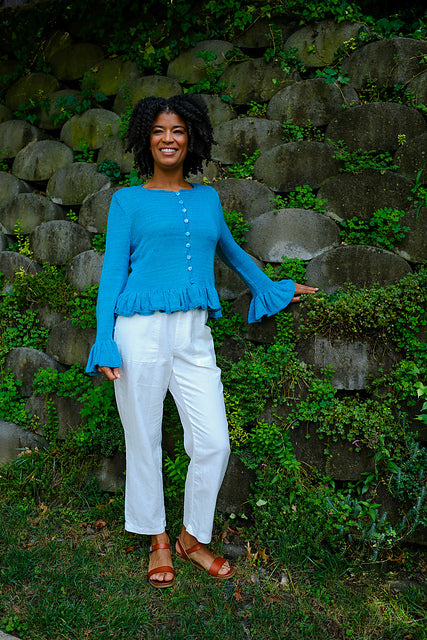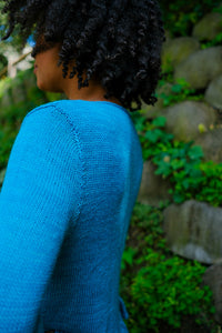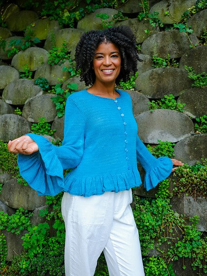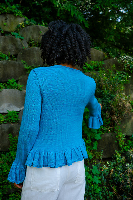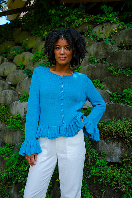 Sardinia is a cardigan that can be worn open as a second layer or closed as a first. Larger needles keep the ruffles soft with maximum drape; smaller needles and a firmer gauge make the body of the garment crisp in contrast.