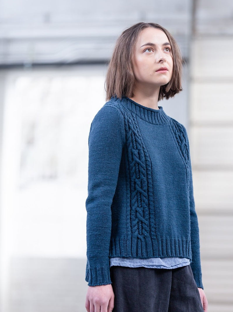 A rolled edge at the collar and a split hem give the Seamark pullover an air of rugged nonchalance. Knit in worsted-spun DK weight Arbor yarn, the meaty ribbing at the hem and collar flows into cables that twist and knot up to the shoulders. These elements combine in a sturdy pullover reminiscent of the fisherman sweaters of yore.