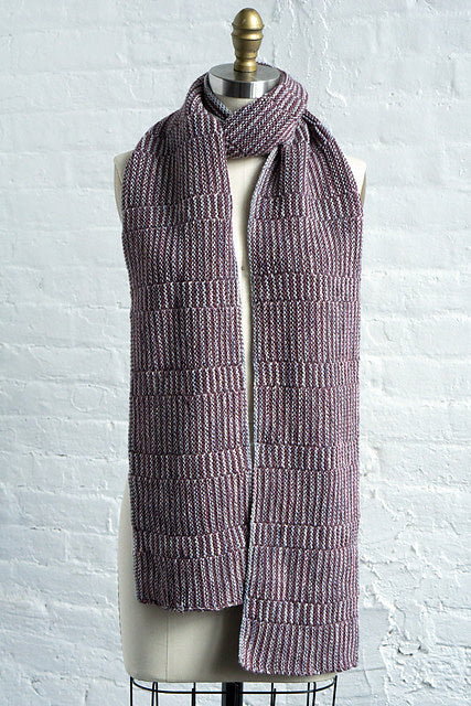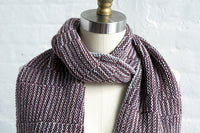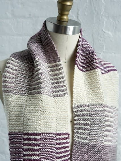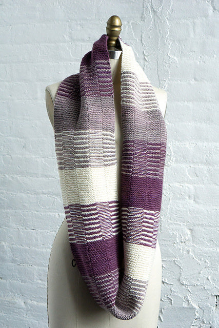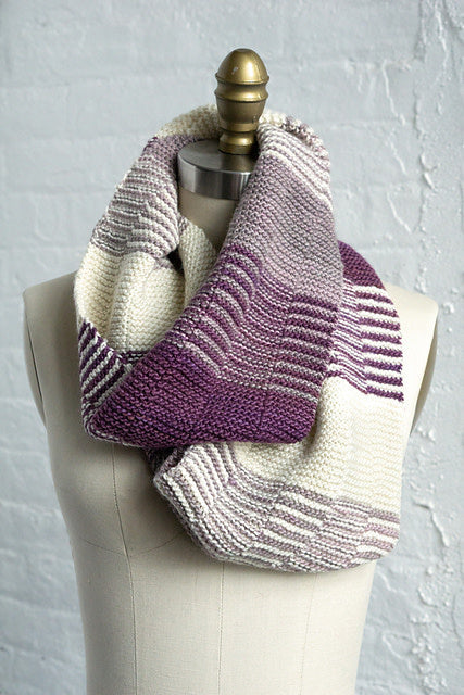 Cowl: Manos del Uruguay Silk Blend 1 sk each of A, B, and C; shown in 3014 Natural (A), 3025 Shale (B), and 3223 Plum (C)