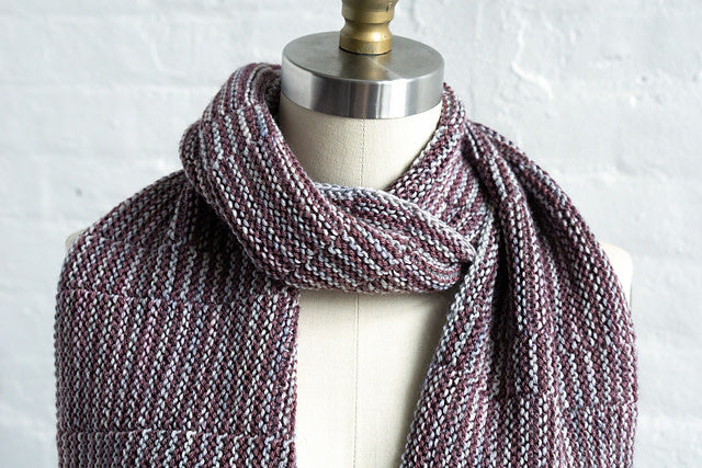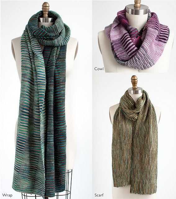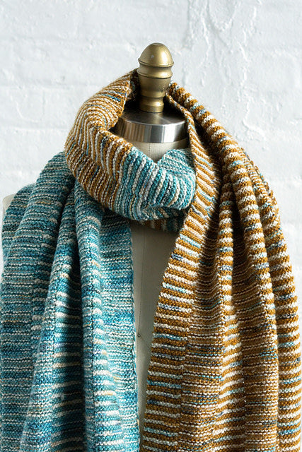 Wrap: Manos del Uruguay Milo 2 sks of MC, and 1 sk each of CC1 and CC2; shown in i7049 Cadaques (MC), i2220 Roma (CC1), and i2428 Nautilus (CC2)