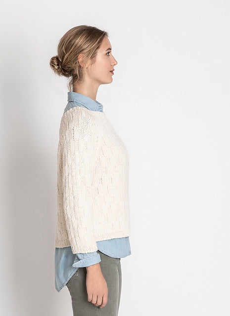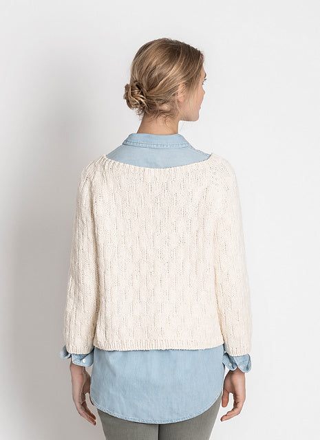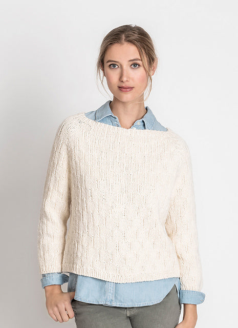 Knit from the top-down in soft organic cotton, this beautiful sweater has subtle allover texture. Easily adjust both the body and sleeve length to your desired fit.