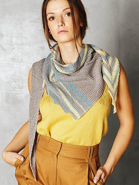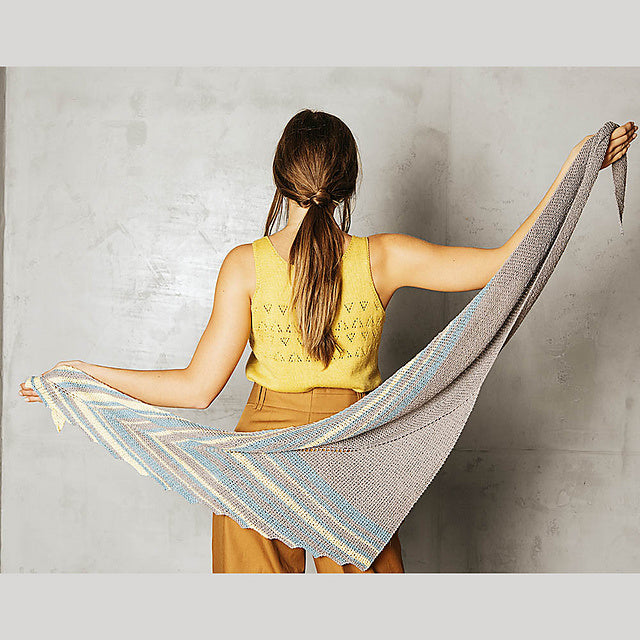 The shawl is an asymmetrical triangle with uneven stripes. It is