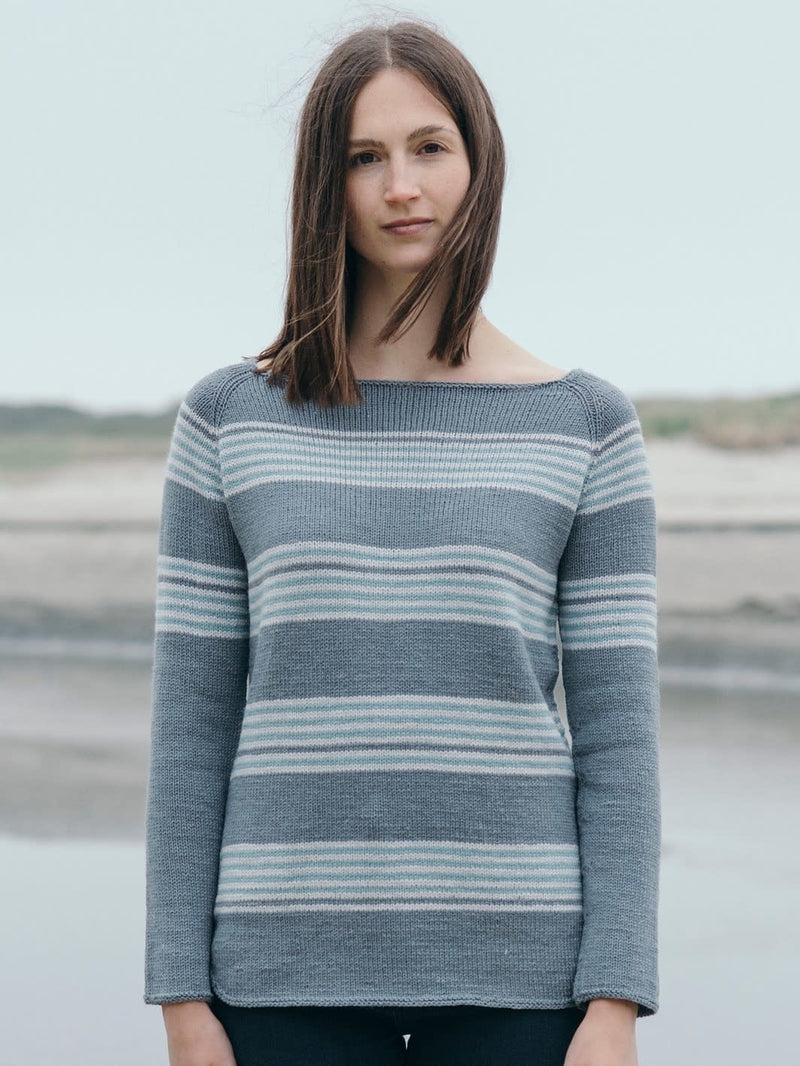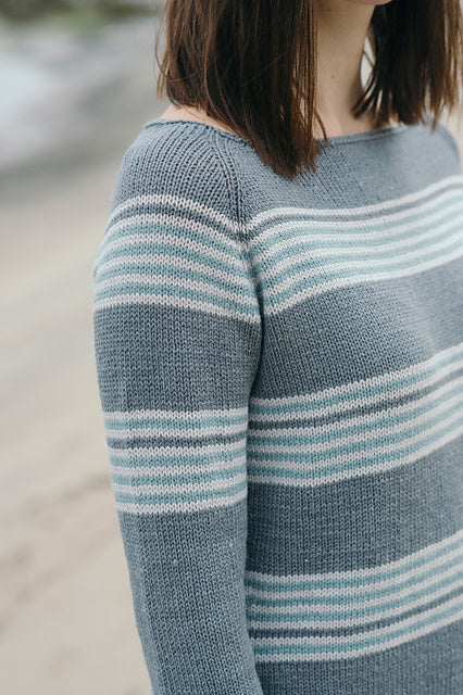 Sophisticated stripes sing in Sidra, designed by Isabell Kraemer. This top-down beauty features a raglan yoke, rounded hem shaped by short rows, and in-the-round construction for both body and sleeves. Worked in three colors of Tern, the color placement on this piece lends a fresh update to the classic striped pullover.