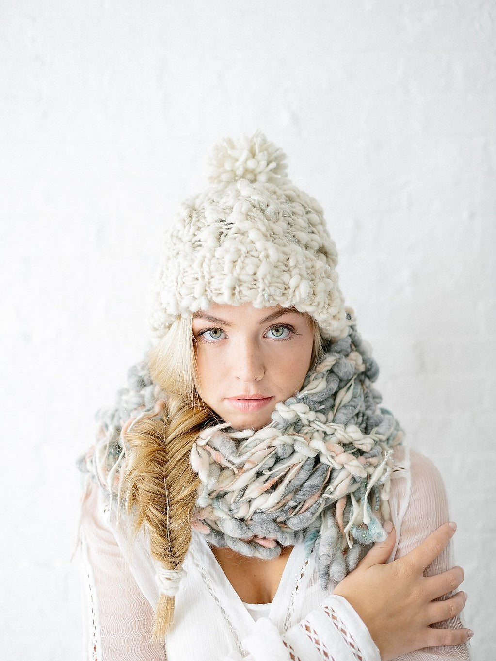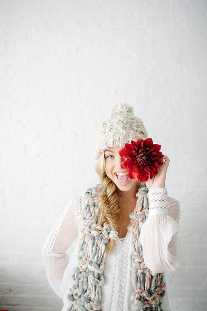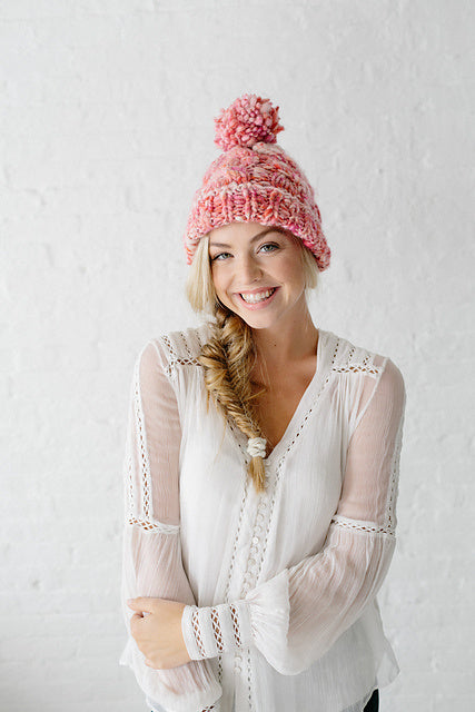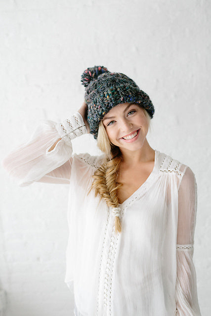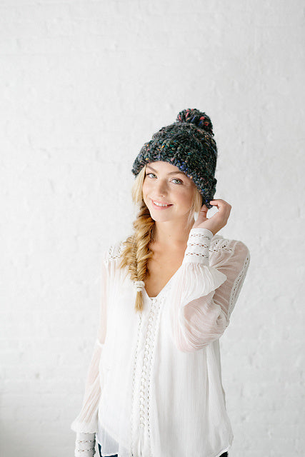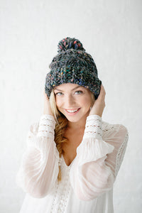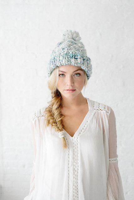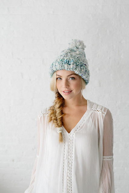 Our Snow Bunny Hat pattern features a rib brim, cable knitting and our own beautiful handpsun yarn. The uneven texture of the yarn and hint of sparkle throughout truly make this hat unique and perfect for winter. Knit yours in either our Swirl, Daisy Chain or Cast Away yarns.