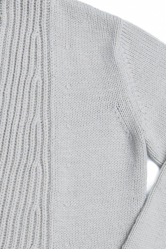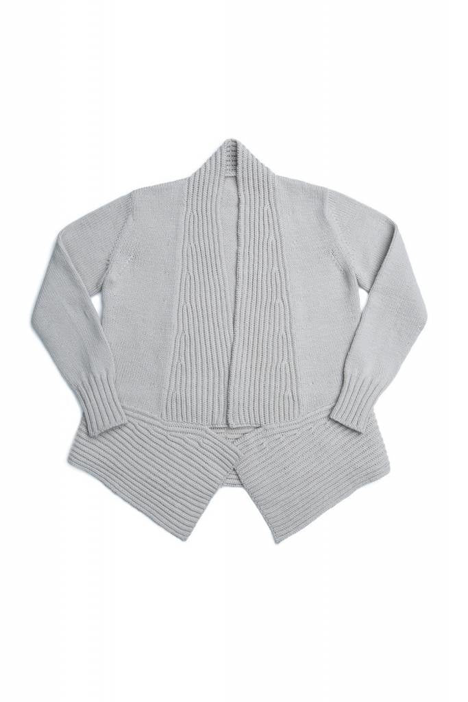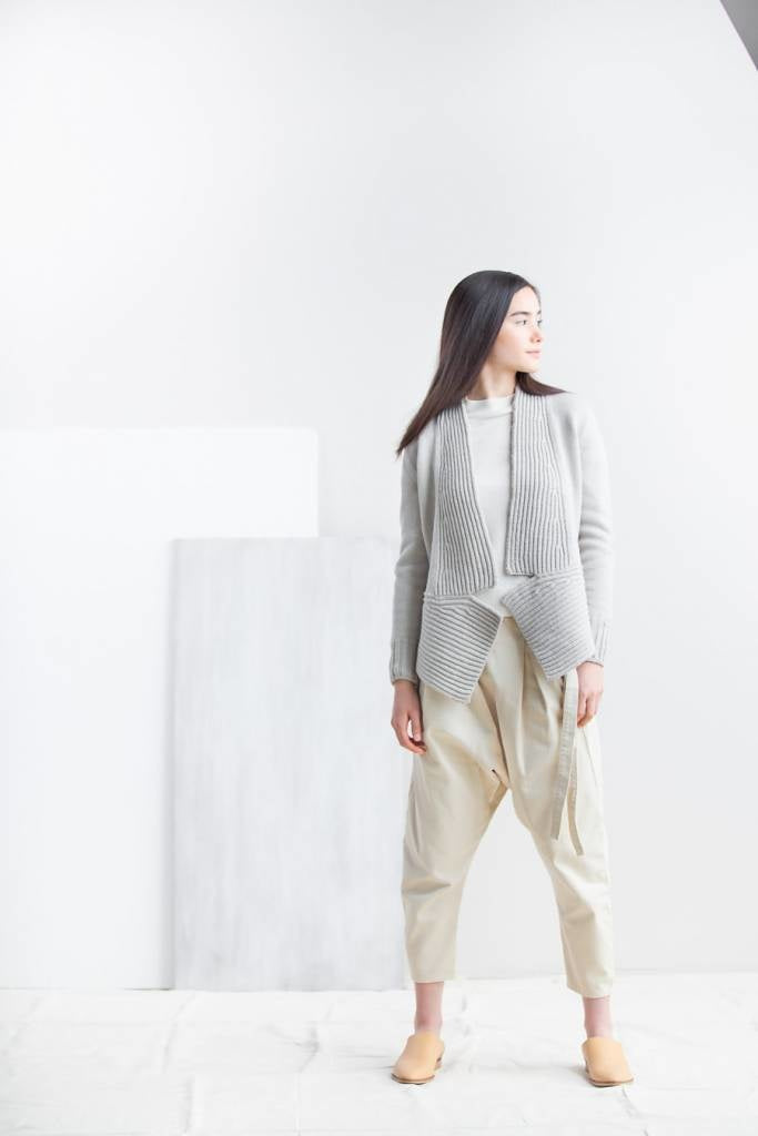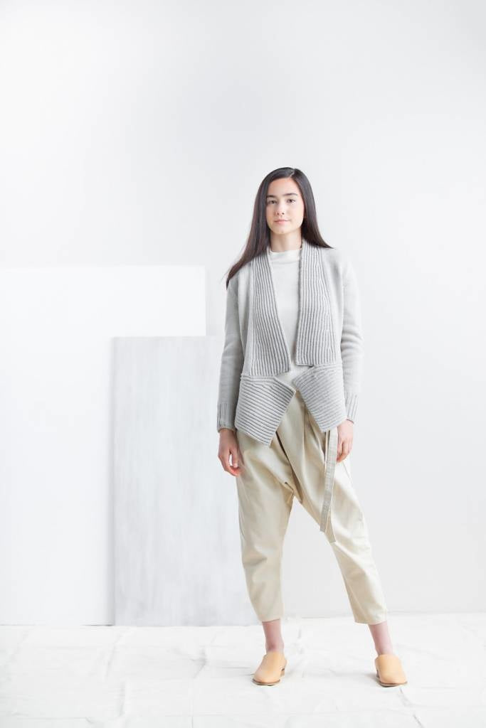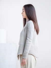 Sonobe is an impactful, open-front cardigan whose ingenious construction marries knitting and modular origami. A meandering band of brioche ribbing forms the peplum base of the garment, guiding the eyes along paths both angular and curvilinear. The dramatic A-line flare of the hem is mirrored by jutting brioche lapels, while the rest of the body is left in trim stockinette for a piece that is altogether greater than the sum of its parts.
